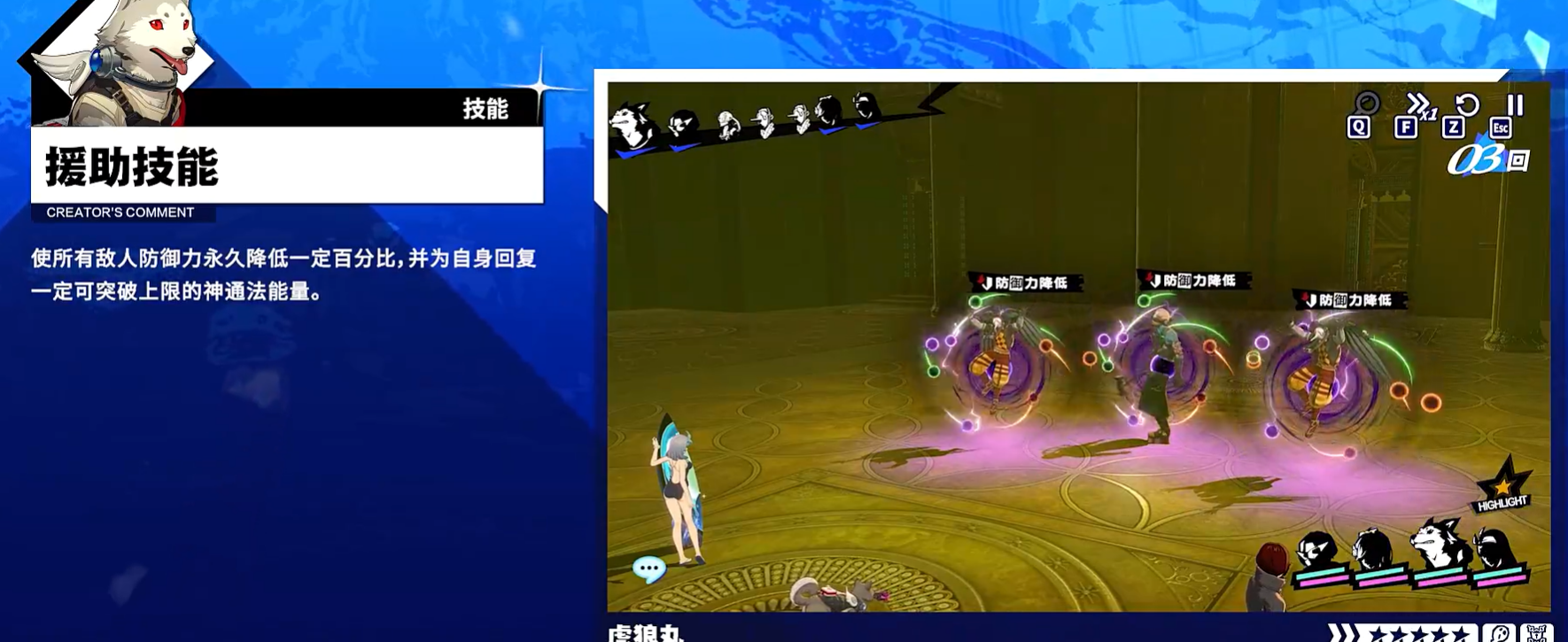 虎狼丸最核心的机制是,战斗开始时,要手动指定一名同伴当饲主,这个步骤不能省,选完之后,他会自动释放援助技能,之后就进入跟着饲主走的状态了。选不同类型的同伴效果还不一样,如果饲主是S.E.E.S.的队友,饲主可以直接通过援助技能栏里的指令,让虎狼丸放技能,而且这之后,饲主还能继续用自己的援助技能,相当于多出来一个操作空间。如果饲主不是S.E.E.S.的队友,那虎狼丸就会在饲主回合开始时,按照饲主的属性自动判断放哪个技能,这种情况下,就没那么多手动空间了,更偏向自动配合的感觉。虎狼丸虽然没有自己的回合,但他在饲主回合开始和结束的时候,该触发的效果还是会触发,所以这块不用担心会白白浪费掉。