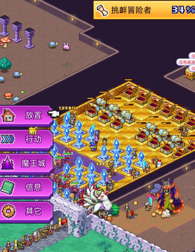 关于魔王本体保护策略:初期可将“魔王宝座”暂置小型隔间内,待魔王入场后,立即使用墙体或陷阱封闭该房间出入口,随后移出宝座并重新安置于更深层位置。此操作可彻底阻断勇者直攻路径,特别适用于魔王等级偏低或遭遇高战力勇者突袭的情形。随着城堡扩建进度推进,魔王宝座需持续向地图最深处迁移,避免早期被突破核心防线。同时,在核心区域外围环形部署高阶怪物单位,形成动态缓冲防线。