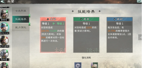主要的核心特色就是优先提升兵营等级,集中相应的资源培养众多具有特技的士兵。首先要注重的就是兵营建设以及征兵,具体的士兵等级和兵营绑定是非常关键的,士兵等级并没有办法单独提升,完全取决于兵营的等级,当兵营升级之后,士兵便会自动获得对应的等级基础属性。日常征兵非常关键,每天务必都要及时进入募兵所完成征兵,并及时返回兵营,完成升级,士兵的基础属性越强,后续培养收益也就越高。