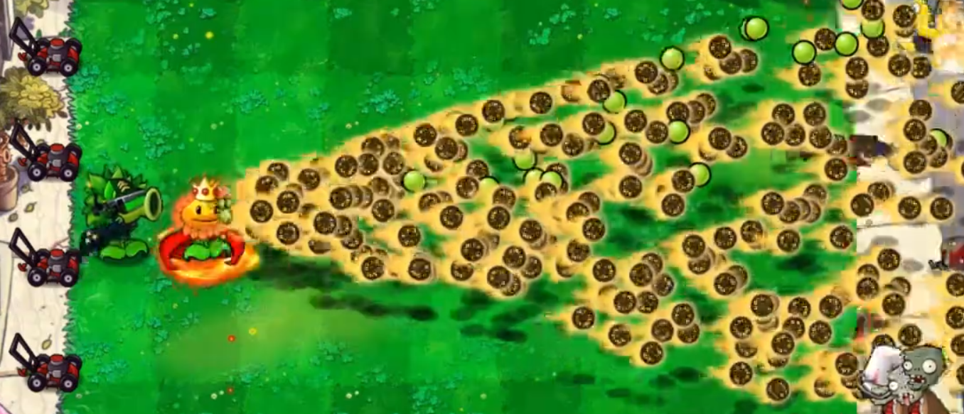 除了稳定的基础输出,它还拥有强力的随机大招机制,每次发起攻击时,都有 10% 的概率触发大招效果。大招开启后,会向大范围区域散射累计约 500 颗豌豆子弹,密集的豌豆弹幕能覆盖大片战场,对范围内的僵尸形成毁灭性打击,即便是密集的僵尸潮,也能在大招的火力覆盖下被快速清理,成为突破僵尸防线、守护阵地的关键技能。
