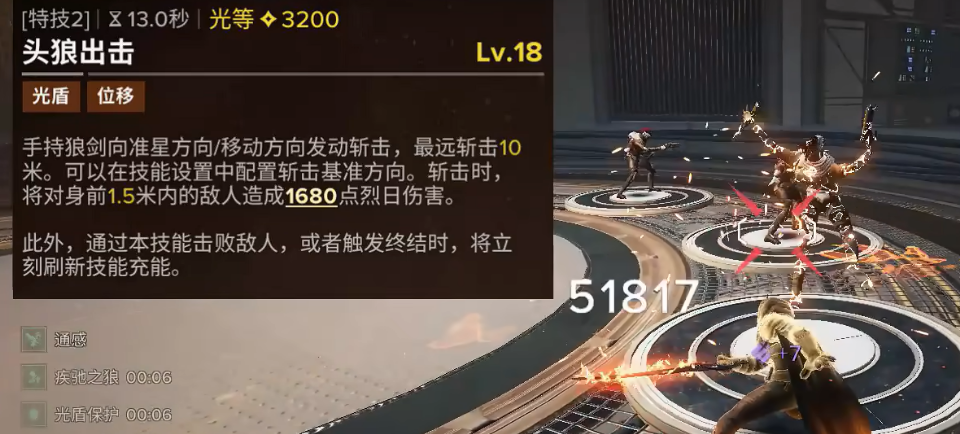 特性这边也有几个值得注意的地方,灼烧攻势让放完一技能之后,跑动速度提升,方便快速追敌人或者调整位置,不用放完技能站在原地等,狼性满的时候一技能会变成强化版本,攻击范围更大,效果也更好,同时还出光盾,这两个叠在一起打感觉差别挺明显的。