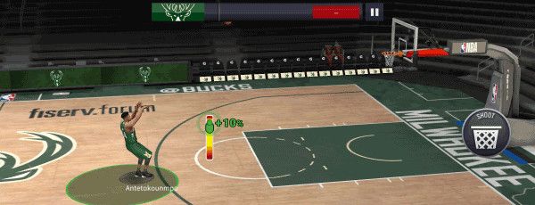 15、跳起左臂挡住眼睛扣篮——跑向篮筐,按“投篮”起跳,接着按“靠打+扣篮”扣入。