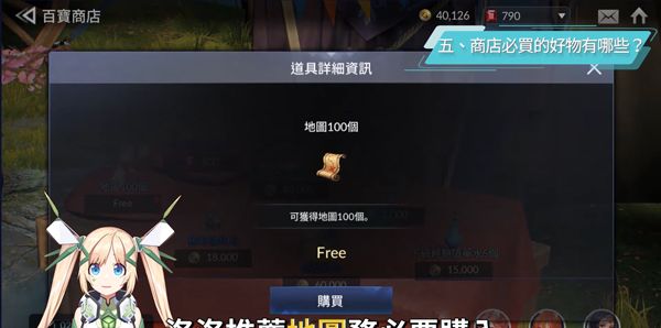 在杂货商店中,不只是可以用金币购买到强化石、地图,以及灵魂石等资源,甚至不时还会免费提供道具。洛洛推荐地图务必要购入,其他杂物则可以根据需求花金币选购。另外杂货商店内的强化石和破坏石最好也给他买起来,毕竟后期培养还是很有需要的喔!