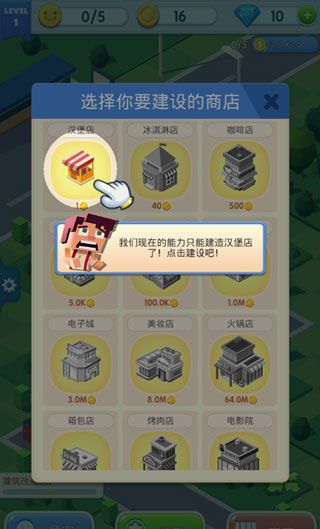 为了保证商业街的多类型与繁荣度,游戏中给出了多款不同风格的建造商店,在这里玩家可以选择相应的建造来完美分配商业街的特色,其中包含了美食产品的提供,汉堡店,冰淇淋店、咖啡店、火锅店等,另有其他的,如电影院,美妆店等,诸多缤纷的商业建筑群,共同组建了该游戏。