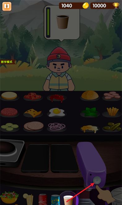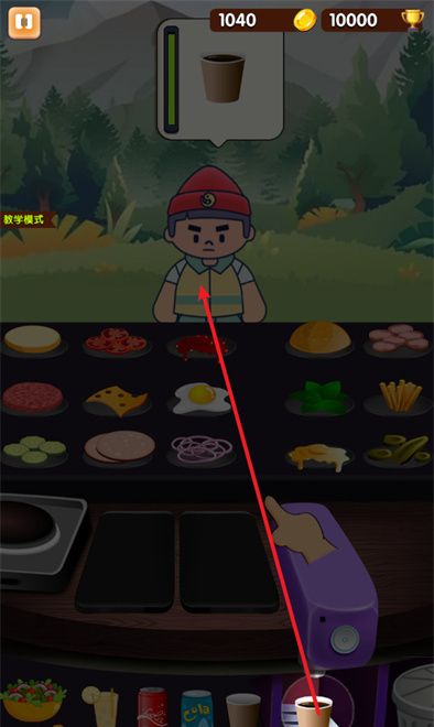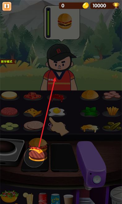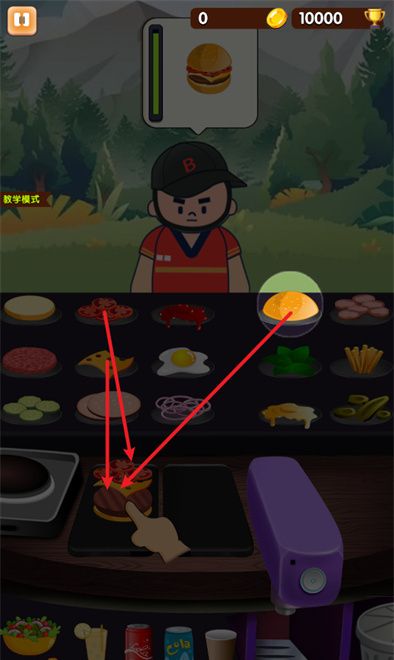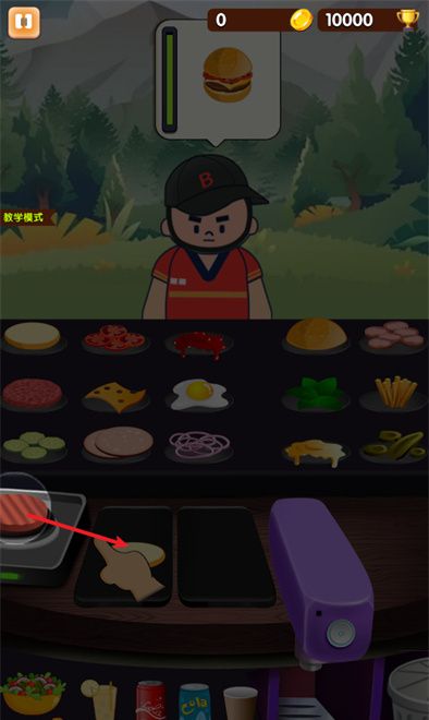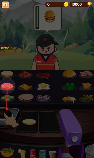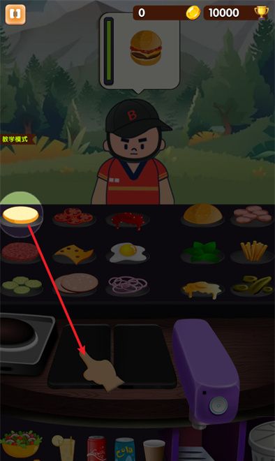 2、进入到教学模式之中后,玩家可以按照顾客的需求来进行汉堡的制作,首先需要拖动汉堡胚到盘子上;
