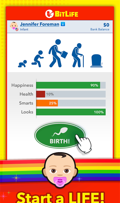 BitLife是一款模拟人生类的游戏,游戏操作起来的方式轻松简单易上手,灵活的手指点击操作完成挑战,加上丰富的操作玩法以及完美的交互系统,能够开启你不同的人生。在这里,你的性别、属性、天赋擅长都是随机的,只有你自己所做出行动和选择可以改变它们,不同的选择会导致您进入不同的增长线,体验全新的模拟人生,从出生到长大成人再到逐渐的老去,游戏可以体验无数次,也会有无数次结果。
