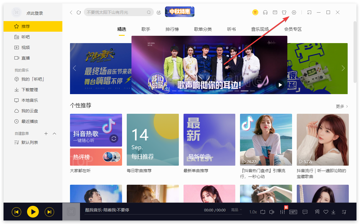 1、打开酷我音乐电脑版,在右上角点击齿轮状的设置图标,如图所示