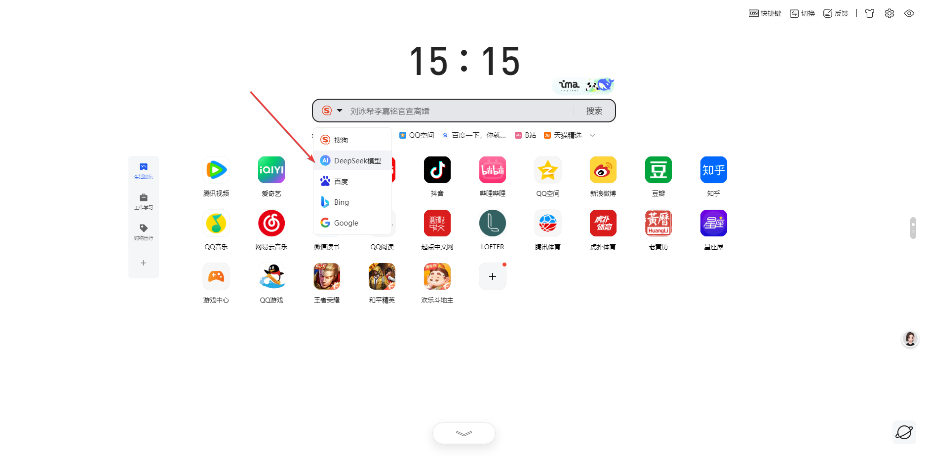 1. 地址栏、导航页、新标签页搜索框新增搜索引擎DeepSeek模型