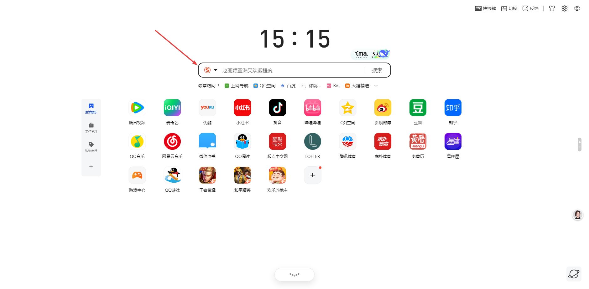 1、打开QQ浏览器电脑版,新建一个标签页,点击搜索框左侧的图标