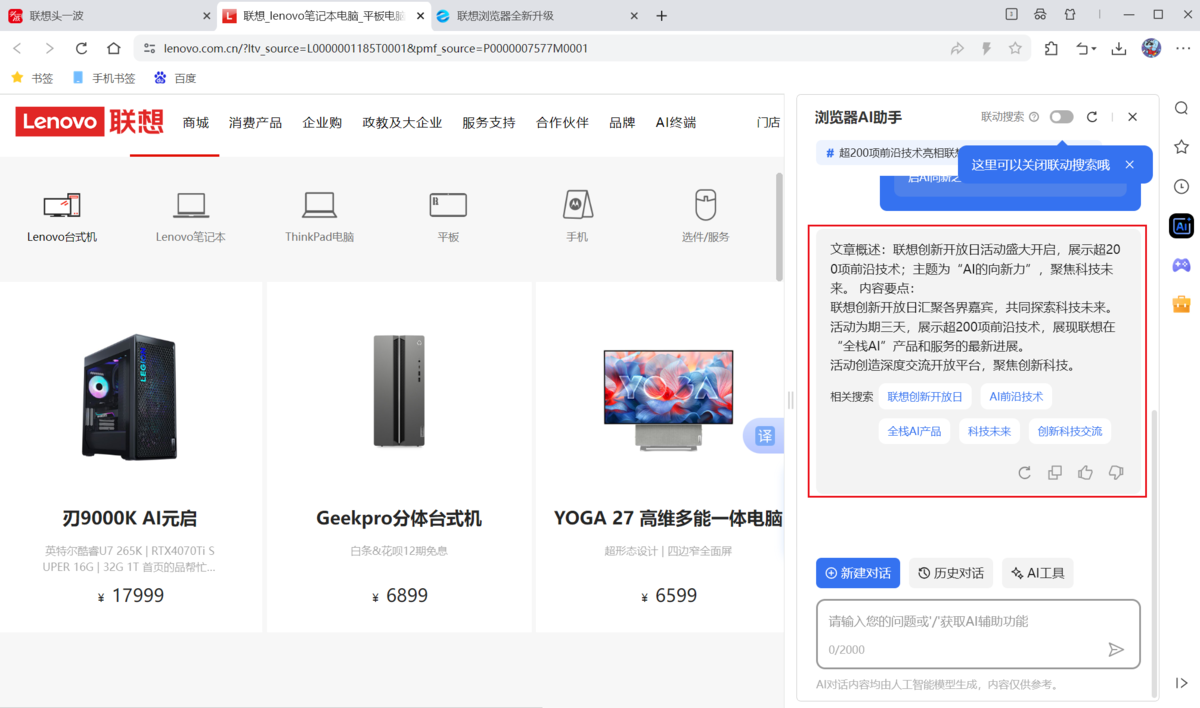 联想浏览器是一款64位的高性能浏览器,使用Chromium内核,为网络浏览带来强有力的性能保障。具有网页提前加载、内存智能释放的功能,在浏览时带来更流畅的体验。内置联想AI助手,可以帮助你进行搜索、总结、写作等任务,为办公带来极大的便利。界面简洁,主页无广告,支持自定义外观。