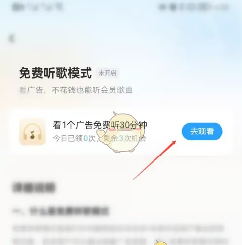 3、找到“看广告免费听30分钟”,点击“去观看”开启免费听会员歌曲模式。