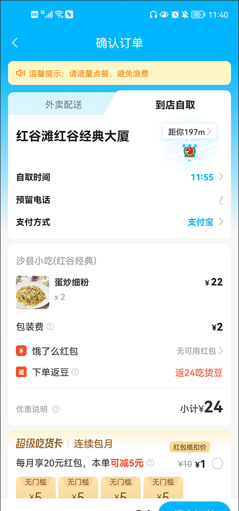 3、进入商户点好餐进入结算界面后,找到页面顶部的”到店自取“一项,点击进入。