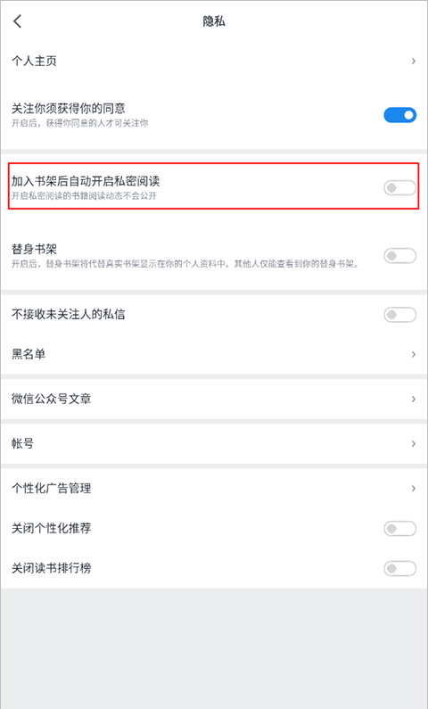 3、在隐私界面点击“私密阅读”右侧的开关即可进行设置啦,还可以通过设置“替身书架”来提升你的阅读体验!