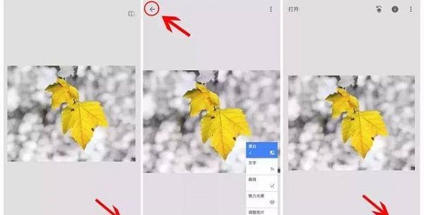 第四步,涂抹完成后,就可以点击右下角“√”,再点击左上角箭头,回到主页面,背景就变为黑白,树叶保留原来的黄色,直接导出照片即可,这就完成了一张蒙版单一色彩的处理。