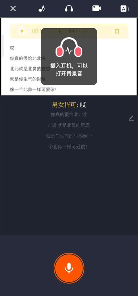 2、进入之后,带上耳机,点击下方的麦克风按键进行录音,完成录音后可以点击又上方的勾进行保存。