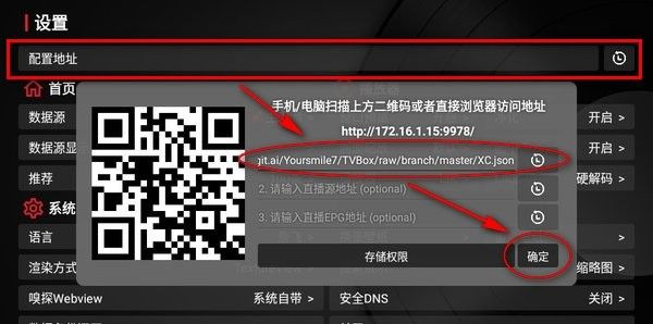 2、然后点击“设置”下面的“配置地址”,在第一个框贴入上面其中一个配置地址,点击“确定”即可。