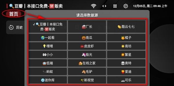 3、回到主页,点击“首页”就可以看到很多数据源,随便选择一个,就可以开始看视频了。