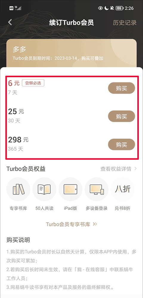 2、在续订Turbo会员界面选择好开通会员的时长然后点击购买选项;
