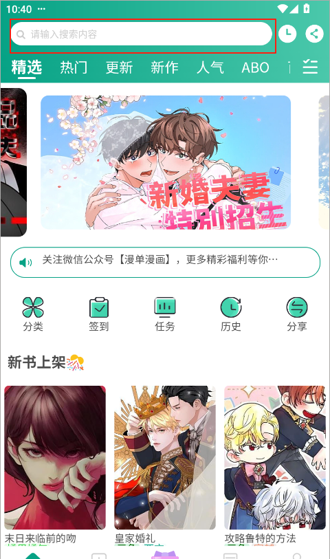 1、打开漫单漫画app进入首页,可以在搜索框中搜索想看的漫画,也可以在精选、热门板块找