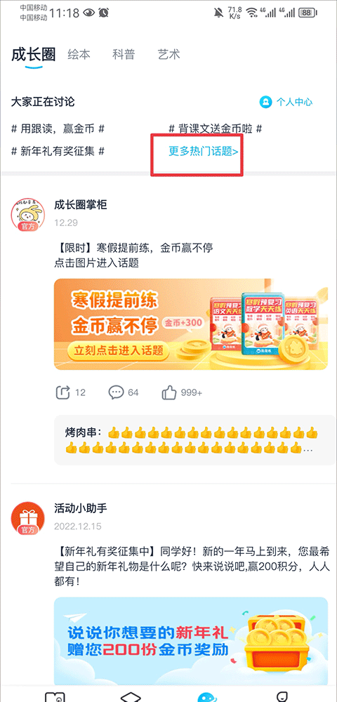 1、在成长圈界面中,点击更多热门话题