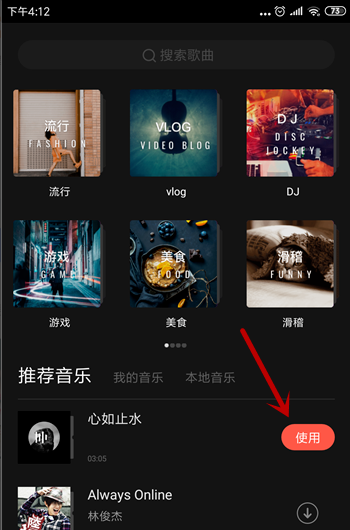6、在乐库里找到一个合适的音乐后点击下载,下载完成后点击【使用】。
