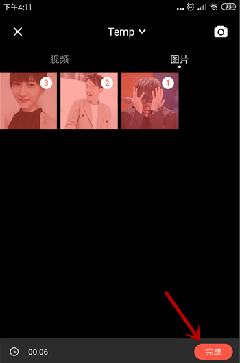 2、接着就会打开手机相册,这里可以选择一个视频编辑也可以使用图片制作视频,方法都差不多,我们以图片视频为例,选择好图片后点击【完成】。