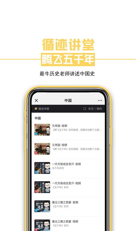 循迹讲堂app是一款在线教育软件,循迹讲堂app云集众多文化人,不忽悠,不卖弄,专注文化,良心出品。循迹讲堂app讲课内容有历史、文学、经济、战争、艺术......世界包罗万象,咱们慢慢来。