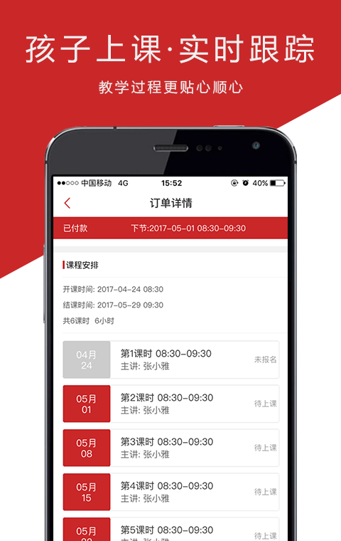 5、查看课表:可在课表中查看孩子上课时间、地点以及上课内容,简单方便。