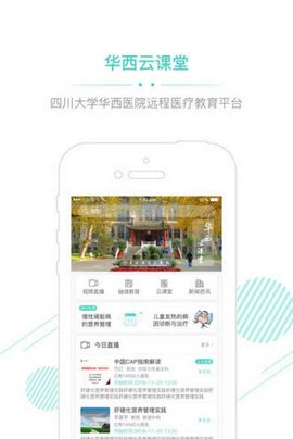 华西云课堂APP是四川大学华西医院的远程移动医疗教育平台。系统收录华西医院专家教授海量的权威教学视频,全面覆盖行政、临床各岗位的教学资源,针对学员提供在线直播、视频点播、课件分享、课程讨论等学习方式,系统根据学员需求针对性推荐课程内容,学员在线完成继续教育学习,通过考试测评后获取继教学分。