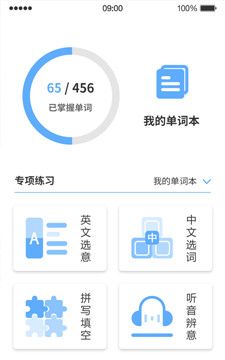 趣V英语app包含英文选意、中文选词、拼写填空、听音辨意四种专项练习,可针对所有词库或“我的单词本”里的单词巩固学习,专业高效。