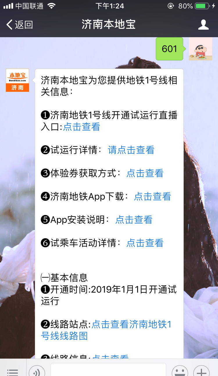 发送:地铁,可以查看其它线路的最新消息、线路站点图、换乘站点等等
