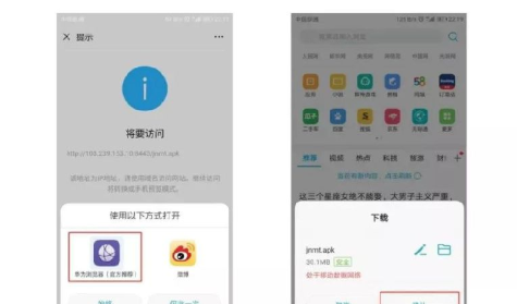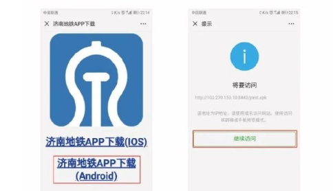 ❸点击下载后,在进入的界面中选“济南地铁App下载(Android),并在接下来的弹窗中选择使用手机浏览器打开,并选择“始终”或“仅此一次”,在接下来的弹窗中选择“确认”,并按照手机提示安装App
