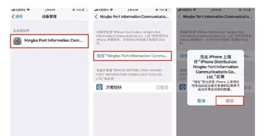 ❻在设备管理中选择“第一个选择框”,选择“信任”,并在接下来的弹框中选择“信任”。此时App已经能正常使用了!
