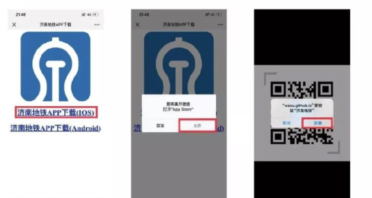 ❸点击下载后,在进入的界面中选“济南地铁App下载(IOS),并在接下来的弹框中选择“允许”,在接下来的弹框中选择“安装”