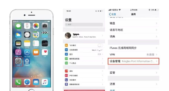 ❺进入手机自带的“设置”,在设置中选择“通用”,在通用中选择“设备管理”