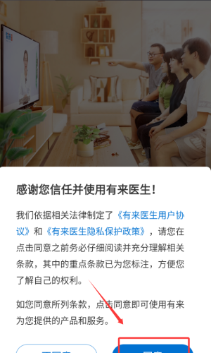 1、首次启动需要阅读并确认用户协议条款,点击同意按钮进入在线医疗平台主界面。