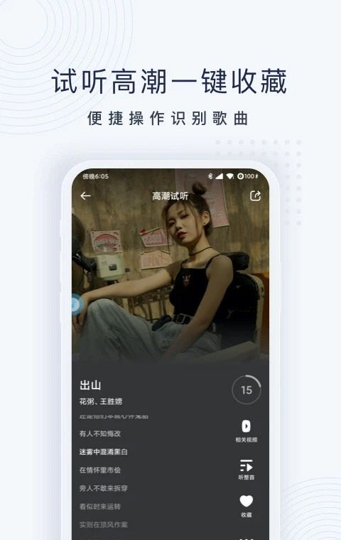 3.高效的歌曲搜索体验,可以听着歌曲的高潮部分直接跳转到音乐播放器听完整版,让歌曲搜索过程更加高效。