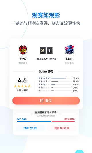 4. 一键分享:你可以在软件中一键分享你喜欢的比赛或选手,让更多的人了解电竞的魅力。