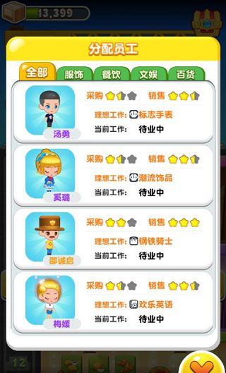 普通商铺中主要包也是包含服饰,餐饮、文娱和百货这些类型,但类型比较丰富,随着楼层的增加还会逐级解锁,同时只需要花费金币即可。