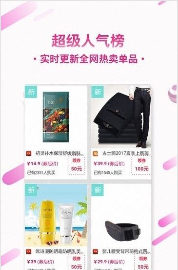 想看别人都买了什么?没关系,省省购优惠券为你实时推送销量top100商品,热门好物一手掌握,再也不怕out啦。
