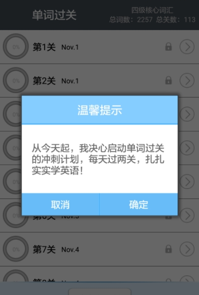 每关20个单词,每个单词都配有中英文例句,看英文选中文,看中文选英文,两遍都对才能过关哦!没有华丽的动画,却能真真切切地助你过关!每天十分钟,争取过两关!