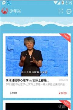 少年强则国强,作为最有价值观的一代,中国的青少年是国家重点的教育对象,他们无论在对于社会,生活以及价值观的认知方面是最值得进行培育的。《少年兴》是一款以青少年教育为主题的视频建学软件,在这款软件中,各位能力超群的青少年们赶快来兑现自己的价值吧!感兴趣的小伙伴赶快来来下载体验吧!