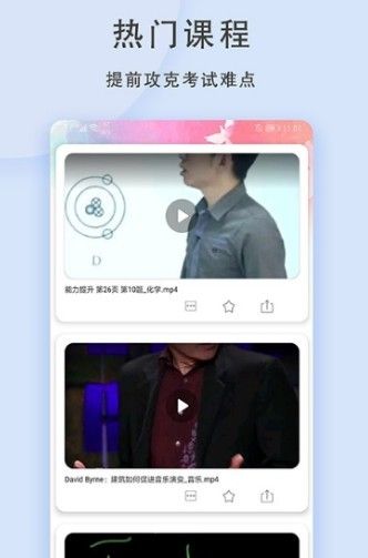丁香视频是一款学习教育类app,覆盖了小学、初中、高中等所有的课程,像语文、英语、化学、手工等课程都可以在上面免费观看,如果你看到自己喜欢的视频,还可以将它添加到自己的收藏里面,方便下次阅读。这里所有的课程都可以免费观看,更有超多的小知识教学视频,实用性非常强,还可以一键添加到本地视频,随时都可以观看。