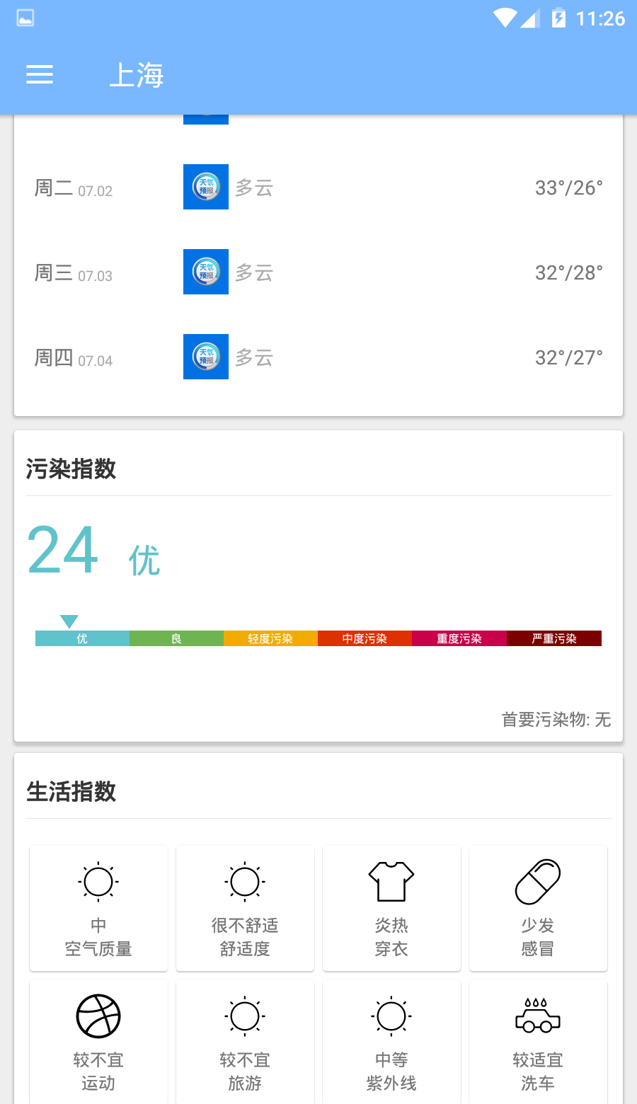 指数服务:指数功能升级,让你快速知晓当天污染指数与生活指数。