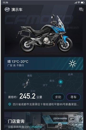 CFMOTO APP是一款智能车载终端,CFMOTO全系列车型都搭载这款系统,集合防盗、监控、定位及摩范圈社区等一系列人机互动和信息互动功能,是一款专业为摩托车爱好者量身定制的移动APP。