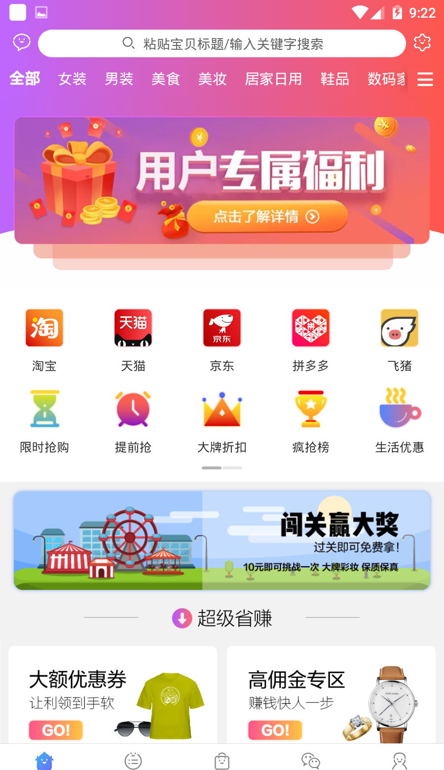 首页:在首页界面里,可以跳转到各大电商平台里,还可以看到系统推荐的商品和特惠商品。