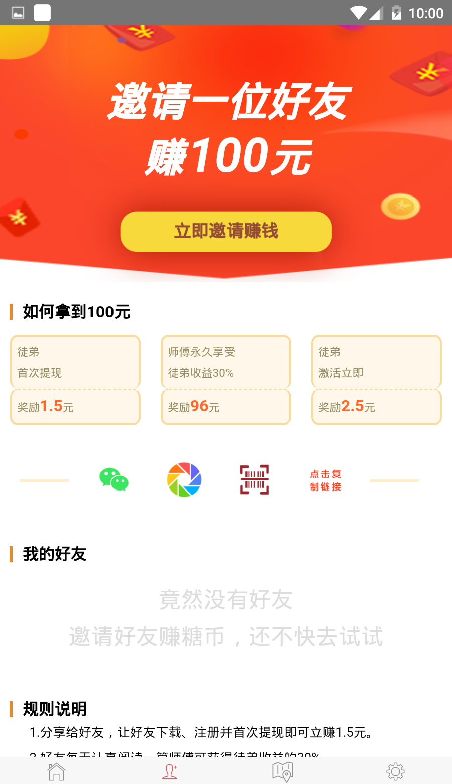 邀请好友:邀请一位好友即可赚100,赶快行动吧。