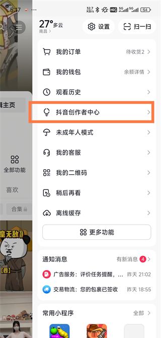 2、点击右上角“三条横线”,选择抖音创作者中心。