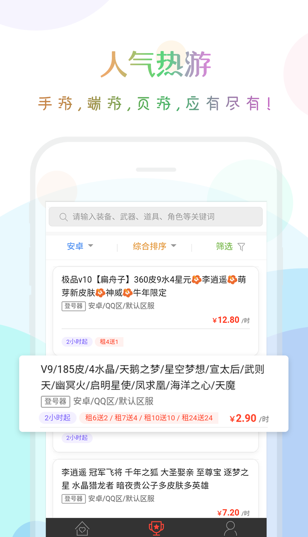 口袋租号最新版这是一款非常靠谱的游戏账号租赁软件,用户可以通过这个软件租赁游戏账号,这个平台是一个正规的平台,非常安全稳定这里,有大量的优质账号,用户可以用超低的价格享受高级账号的乐趣,而且租赁价格也相当便宜。租到心仪的账号后,玩家无需输入账号密码即可快速登录游戏一键玩精品账号,并有防外挂检测脚本等防护功能,确保出租方安全。新用户还可以获得很多新人福利,最低0元即可体验高级游戏账号和影视会员。