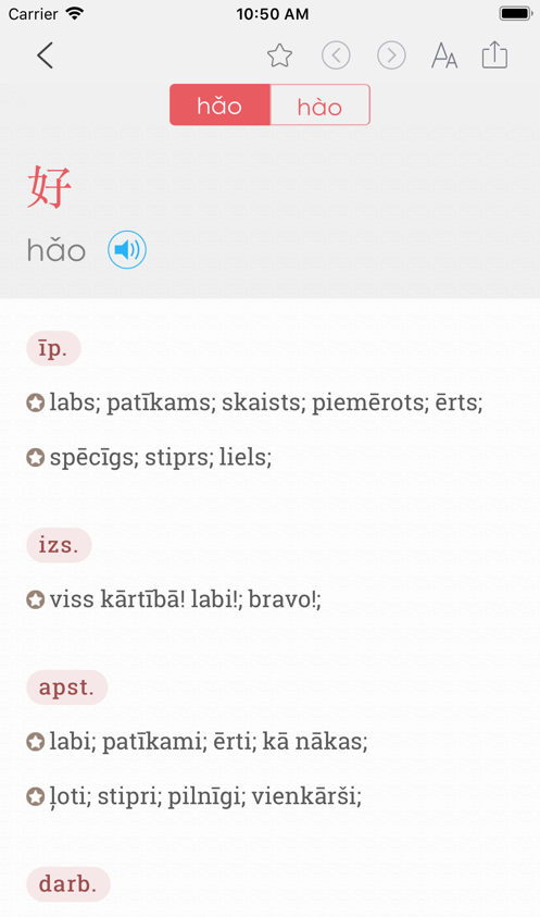 汉语拉托维亚语词典app是一款非常好的学习汉语软件平台,平台是国家汉办孔子学院总部推荐使用的汉语学习平台,适合母语为拉脱维亚语的汉语学习者使用哦,这里全部都是免费的,将更好的为大家提供优质的汉语教学,以及教程来学习,还有很多文化生活类的,各个方面的新词汇和术语全都汇集在平台上了。有需要的用户快来安装体验吧。